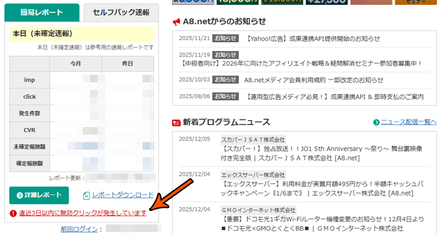 A8.net にログインすると、簡易レポートの下に『直近3日以内に無効クリックが発生しています』と表示されることがあります。